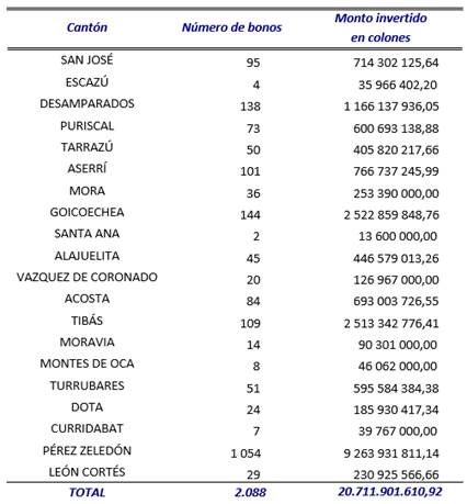 Los datos de distribución del bono de vivienda por cantón para el periodo 2019, reflejan que la mayor cantidad de subsidios fueron solicitados en zonas rurales, fuera de la Gran Área Metropolitana, en los cantones de Pérez Zeledón, San Carlos, Pococí, Sarapiquí y Upala.