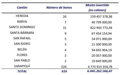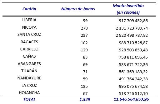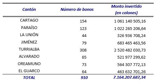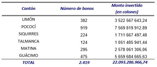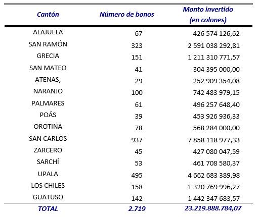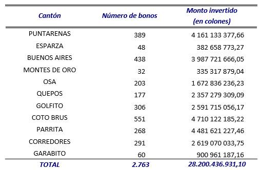 A nivel nacional los tres cantones que presentan mayor inversión en bonos de vivienda son Pérez Zeledón con 1.054 bonos de vivienda otorgados para una inversión de 9.263,93 millones, seguido por San Carlos con 937 bonos y una inversión de 7.858,11 millones y muy de cerca Pococí con 919 bonos recibidos durante el 2019 para una inversión de 7.569,82 millones.